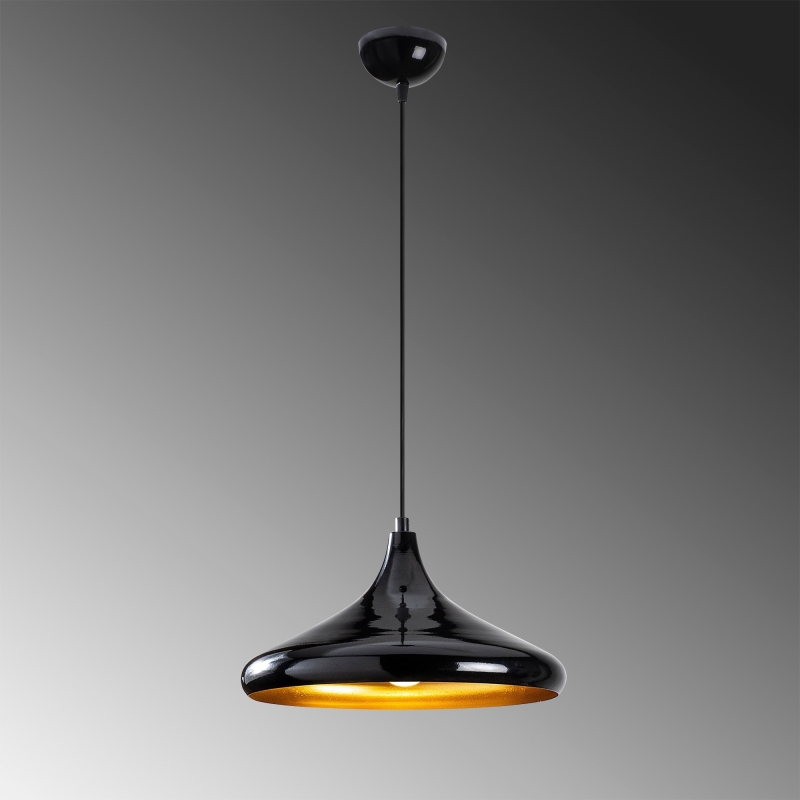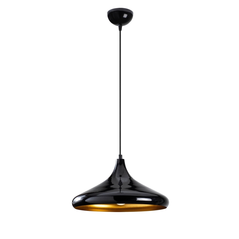 Čierny luster BERCESTE je vyrobený v industriálnom štýle a je zjemnený zlatou farbou vnútrajška tienidla, ktorá prepožičiava svetlu mäkko žlté tóny.