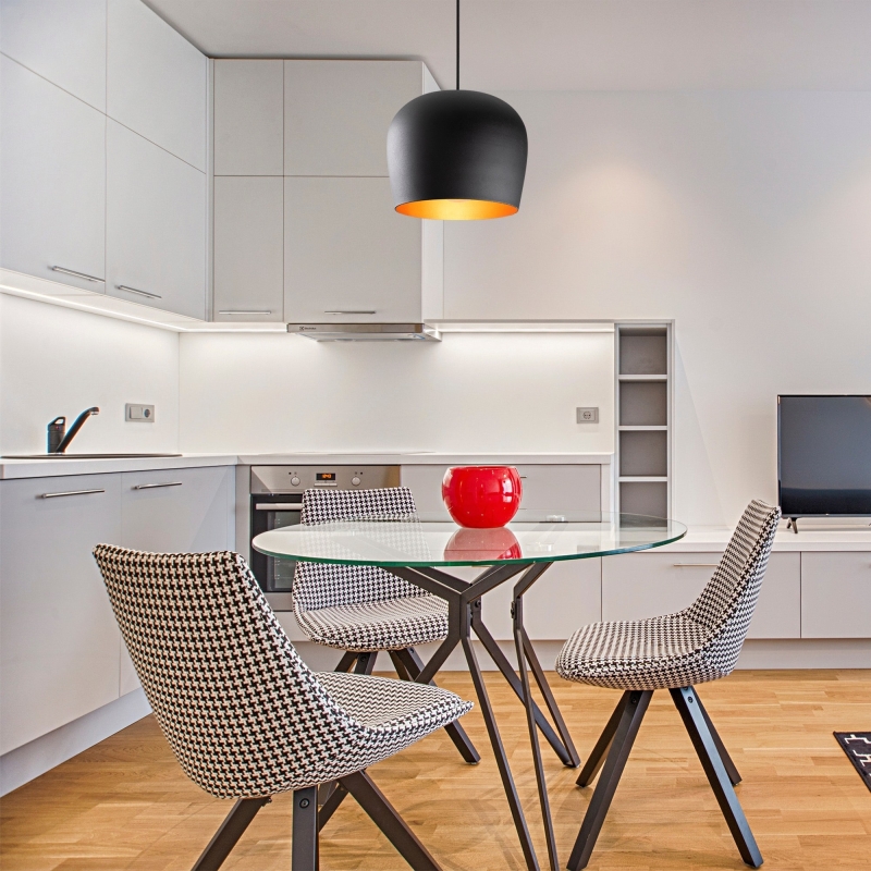 Čierny luster BERCESTE je vyrobený v industriálnom štýle so zlatým vnútrom, ktorý vydáva žlté teplé svetlo.