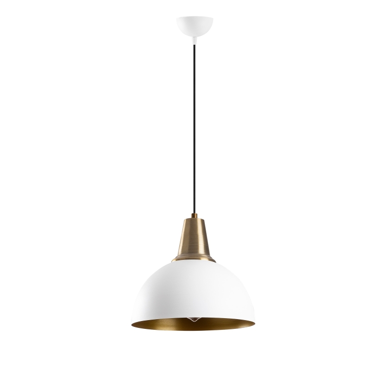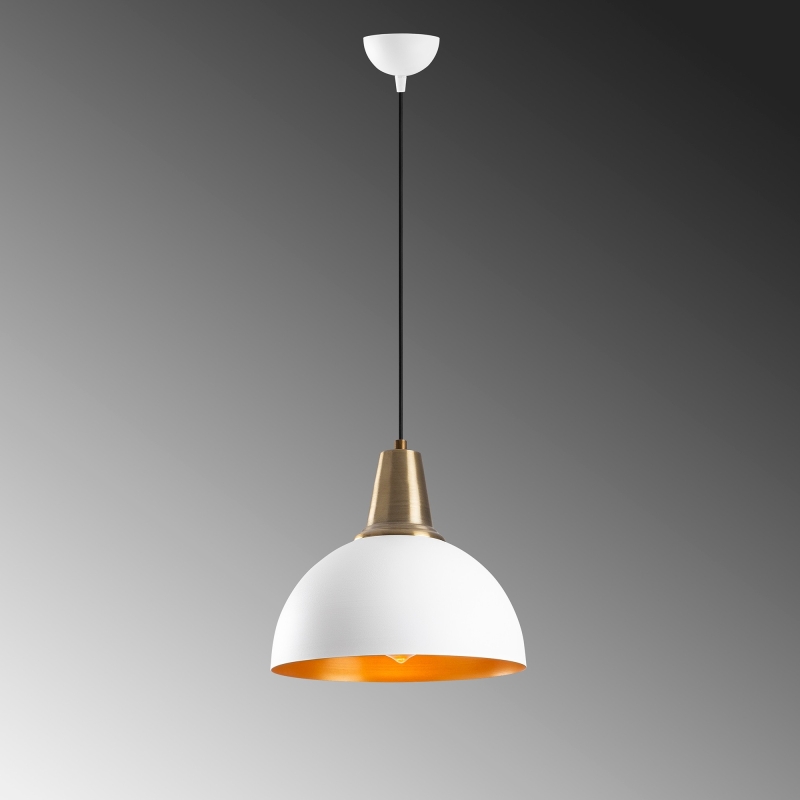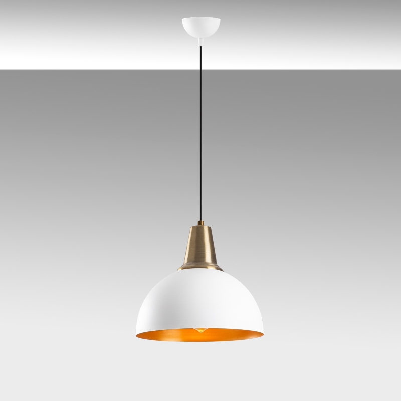 Luster DODO má malú základňu, z ktorej visí ako biela pologuľa robustnejšie tienidlo, ktorého vnútro korešponduje farebne s jeho vrchnou objímkou.