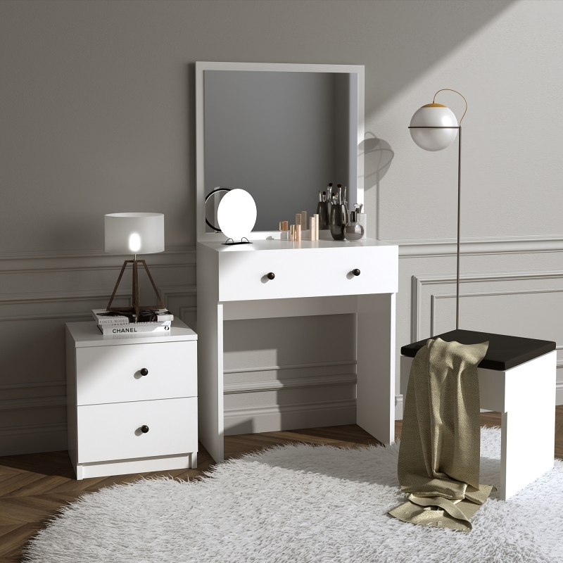 Táto súprava sa skladá z malého nočného stolíka s dvoma zásuvkami, praktickej stoličky a toaletného stolíka.