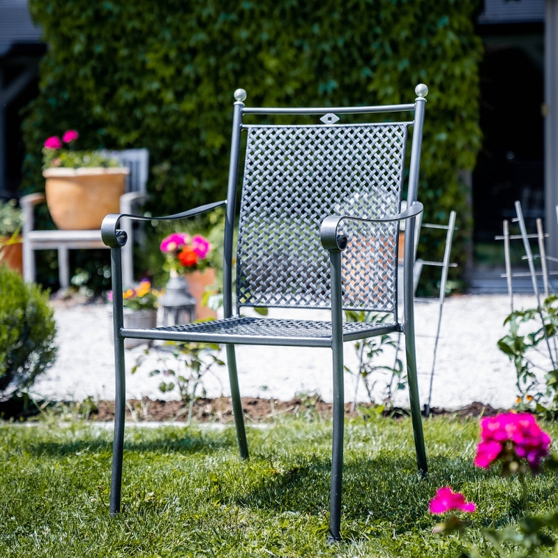 Elegantné kovové kreslo vhodné pre záhrady, terasy, reštauračné záhradky aj interiéry.