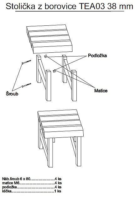 Vysoko kvalitný český výrobok z masívného smrekového drevaDrevo je pasterizované sušením na 80 ° C Stolička je dodávaná v demonte vrátane spojovacích materiálov (skrutky, podložky, krídlové matice) V balení je priložený montážny návod