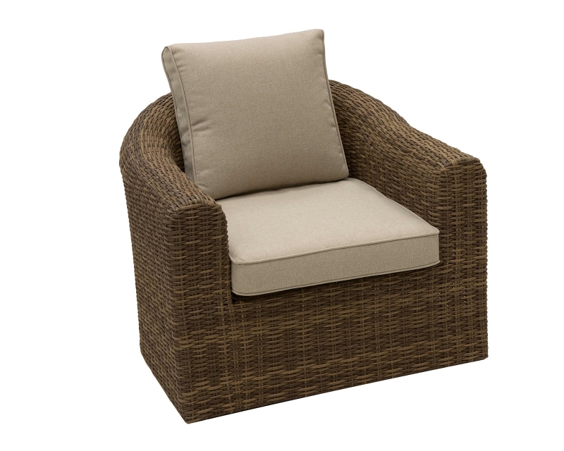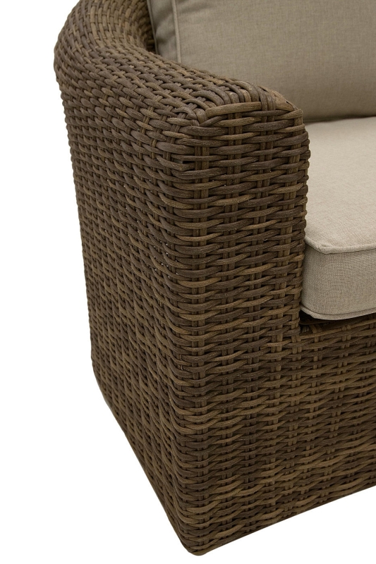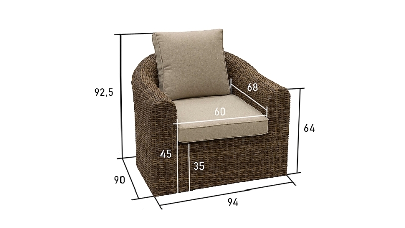 Kvalitný prepletaný umelý ratan v univerzálnom hnedom odtieni štýlovo dopĺňajú sedáky a vankúše z pevnej tkaniny s gramážou 220 g/m2. Sila polstrovania je 10 cm. Lemovanie po okrajoch. Penová výplň.