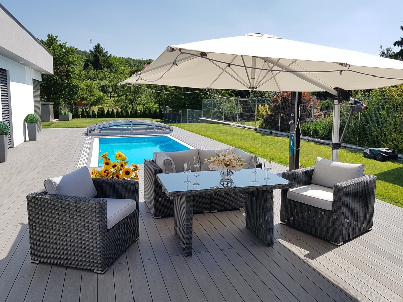 Ratanový nábytok z kolekcie modulových setov, ktorý vyniká svojou variabilitou.Zostavte si súpravy podľa Vašich predstáv.Umelý ratan sa pýši svojím nadčasovým dizajnom a takmer nulovú údržbou. Polyetylénové vlákno sa vyznačuje vysokou pružnosťou, pevnosťou a odolnosťou voči vlhkosti i UV žiareniu. Je odolný voči povětrmostním podmienkam a je vhodný na celoročné státie vonku (odporúčame pod zastrešením alebo ochranným obalom v zimných mesiacoch). Umelý ratan je ľahký, takže zaisťuje pohodlnú manimulaci záhradného nábytku po záhrade či terase.Konštrukcia je vyrobená z robustnej hliníkovej konštrukcie, ktorá je zvarená tak, aby zaistila vysokú nosnosť jednotlivých prvkov. Hliník sa vyznačuje vysokou odolnosťou a pevnosťou. Nedochádza ku korózii.Polstrovanie je v sile 10 cm, jedná sa o látku s hustotou 220 g/m2. Lemovanie po krajoch. Penová výplň. Všetky podušky sú vybavené zipsom.