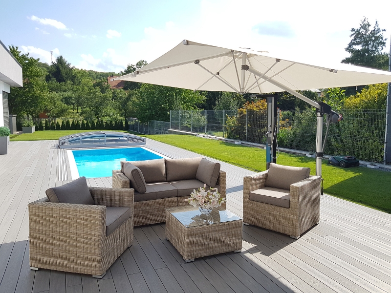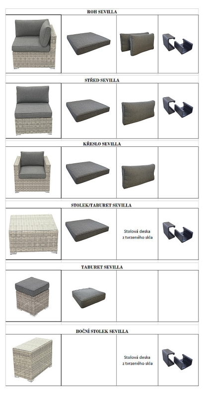 Ratanový nábytok z kolekcie modulových setov, ktorý vyniká svojou variabilitou.Zostavte si súpravy podľa Vašich predstáv.Umelý ratan sa pýši svojím nadčasovým dizajnom a takmer nulovú údržbou. Polyetylénové vlákno sa vyznačuje vysokou pružnosťou, pevnosťou a odolnosťou voči vlhkosti i UV žiareniu. Je odolný voči povětrmostním podmienkam a je vhodný na celoročné státie vonku (odporúčame pod zastrešením alebo ochranným obalom v zimných mesiacoch). Umelý ratan je ľahký, takže zaisťuje pohodlnú manimulaci záhradného nábytku po záhrade či terase.Konštrukcia je vyrobená z robustnej hliníkovej konštrukcie, ktorá je zvarená tak, aby zaistila vysokú nosnosť jednotlivých prvkov. Hliník sa vyznačuje vysokou odolnosťou a pevnosťou. Nedochádza ku korózii.Polstrovanie je v sile 10 cm, jedná sa o látku s hustotou 220 g/m2. Lemovanie po krajoch. Penová výplň. Všetky podušky sú vybavené zipsom.