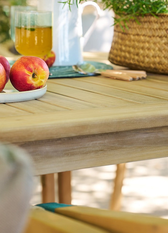 Záhradná zostava z exotickej dreviny akácie má všetko, čo tvorí atmosféru prírodného posedenia.