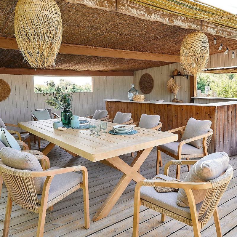 Záhradná zostava z exotickej dreviny akácie má všetko, čo tvorí atmosféru prírodného posedenia.