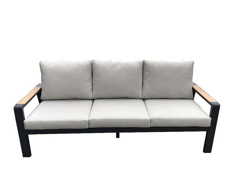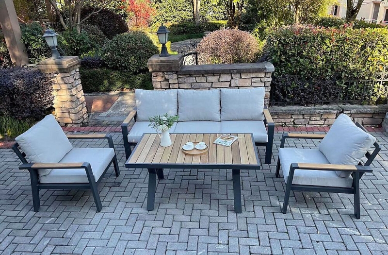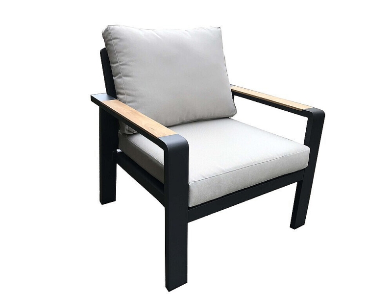Hliníková zostava pre 5 osôb v grafitovom prevedení, doplnená o tíkové podrúčky a dosku stola.
