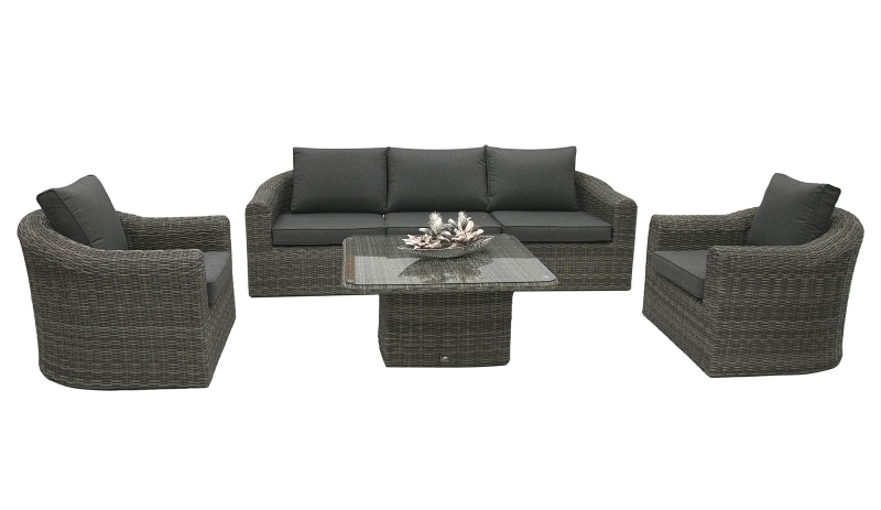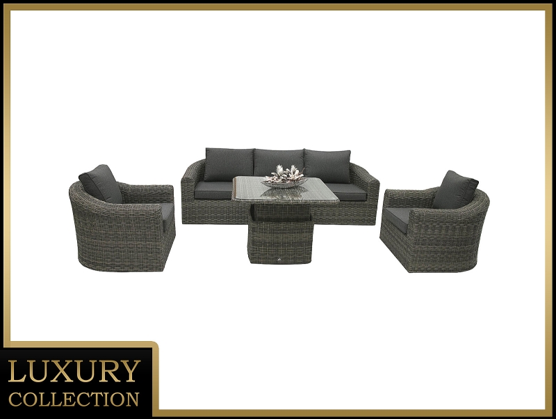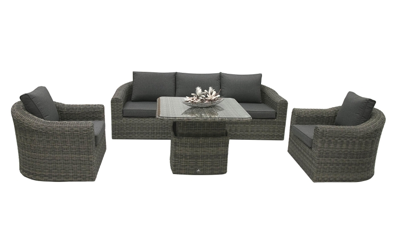 S posedením BORNEO LUXURY sa aj na vlastnej záhrade budete cítiť ako na exotickej dovolenke. Kvalitný prepletaný umelý ratan v univerzálnom šedom odtieni prírodného ratanu štýlovo dopĺňajú sedáky a vankúše z pevnej tkaniny o gramáži 220 g/m 2 , čerešničkou na torte je doplnok v podobe dosky stolíka z tvrdeného skla.
