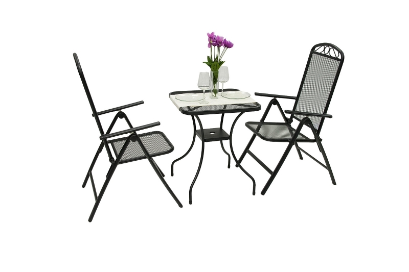 obsahuje dve polohovateľné stoličky a štvorcový stolík s otvorom pre slnečník ,