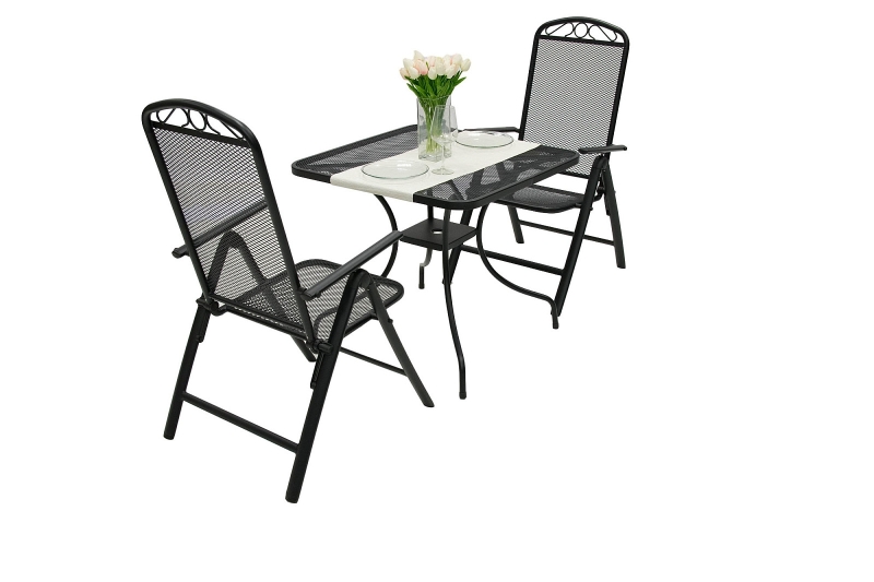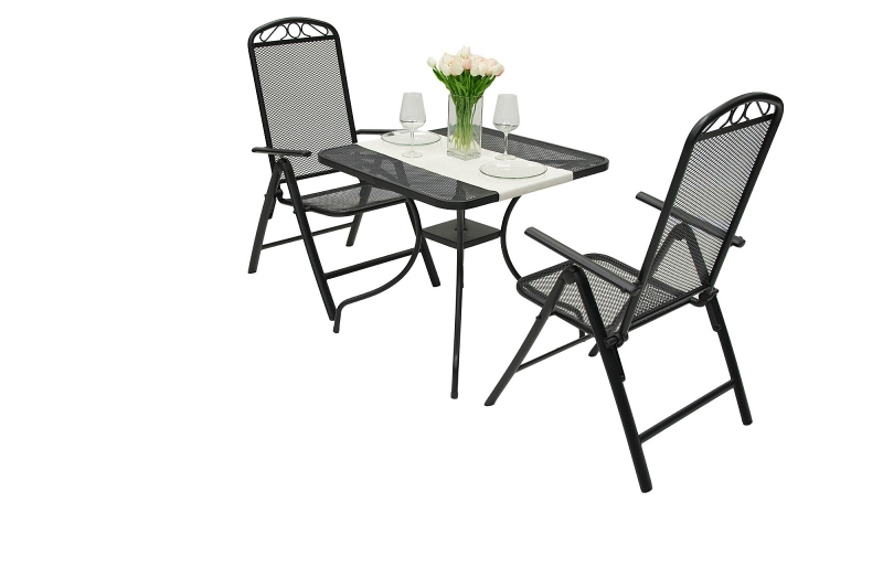 Elegantný dizajn, kvalitný materiál a univerzálna farba . Zostava Ottawa pre 2 osoby je perfektnou voľbou pre páry, ktoré hľadajú posedenie do menších priestorov. Bez problémov sa zmestí na väčšinu bytových balkónov a lodžií. Skladá sa z dvoch stoličiek a štvorcového stolíka (80×80 cm) . Polohovaciu opierku kovových kresiel si nastavíte tak, ako je vám to príjemné. Výplet v hornej časti opierky dodáva nábytku šmrnc. Keď set práve nepoužívate, stačí zložiť stoličky a uschovať ho napríklad do pivnice . Na stolík sa zmestí ranná káva, popoludňajší čaj aj občerstvenie. Uprostred stola nájdete pripravený otvor pre slnečník . Vďaka mrežovanému povrchu sa na stoličkách a na stole po daždi nedrží voda.