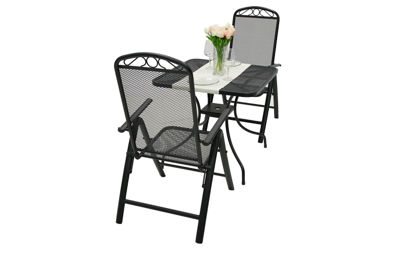 obsahuje dve polohovateľné stoličky a štvorcový stolík s otvorom pre slnečník ,